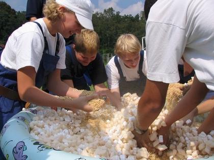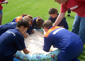 Die Jugendfeuerwehr Teupitz-Neuendorf bei einem der Spaßwettkämpfe: Bei diesem ging es darum, 50 Glasmurmeln in einem Kinderplanschbecken zu suchen.